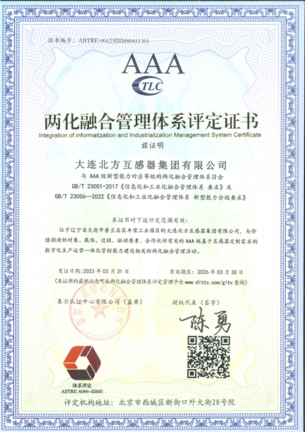 日前,从泰尔认证中心传来喜讯,大连北方互感器集团有限公司(以下简称大北互)通过信息化和工业化融合管理体系认证,取得两化融合管理体系AAA级评定证书,成为全国首家获此殊荣的互感器企业,也是辽宁省首家获此殊荣的民营企业,标志着大北互在工业化和信息化融合上取得重大突破和可喜成果。