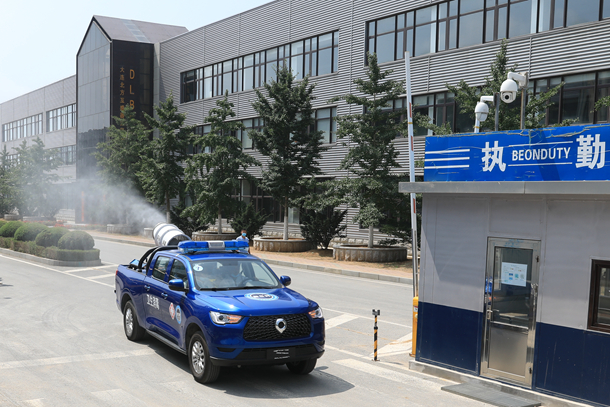 防疫消毒中,瓦普蓝天救援队的专业人员驾驶集喷雾、杀毒和抑尘于一体的皮卡移动消毒防疫雾炮车,消毒液经过雾炮产生的喷雾随着车辆的行进对厂区内的室外通道进行防疫消毒,他们的人道、友爱、专业、奉献让“蓝天”更蓝,路面更洁。